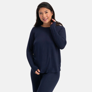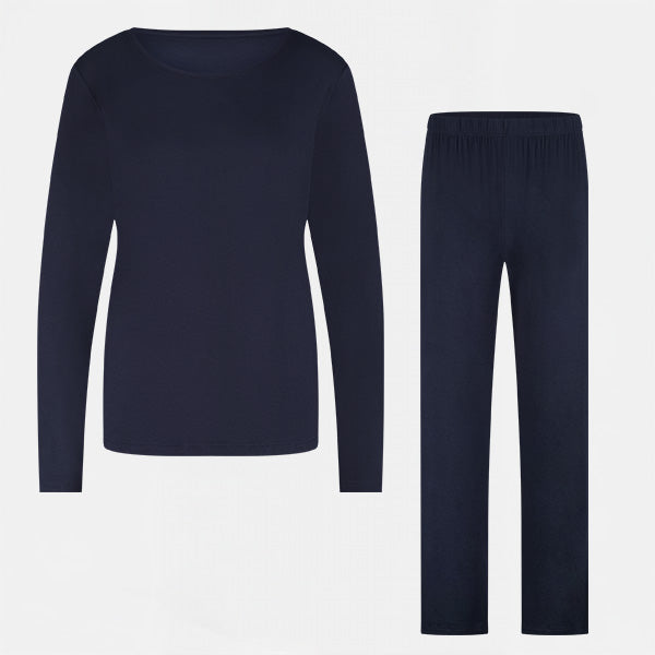 Verleihen Sie Ihren Abenden und Nächten einen Hauch von Eleganz mit diesem stilvollen Damen-Pyjama-Set in klassischem Navy Blau. Die Kombination aus langärmligem Oberteil und langer Pyjamahose sorgt für wohlige Wärme und höchsten Komfort - ideal für kühle Winternächte oder entspannte Stunden auf dem Sofa.