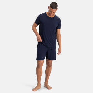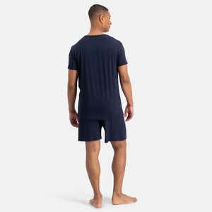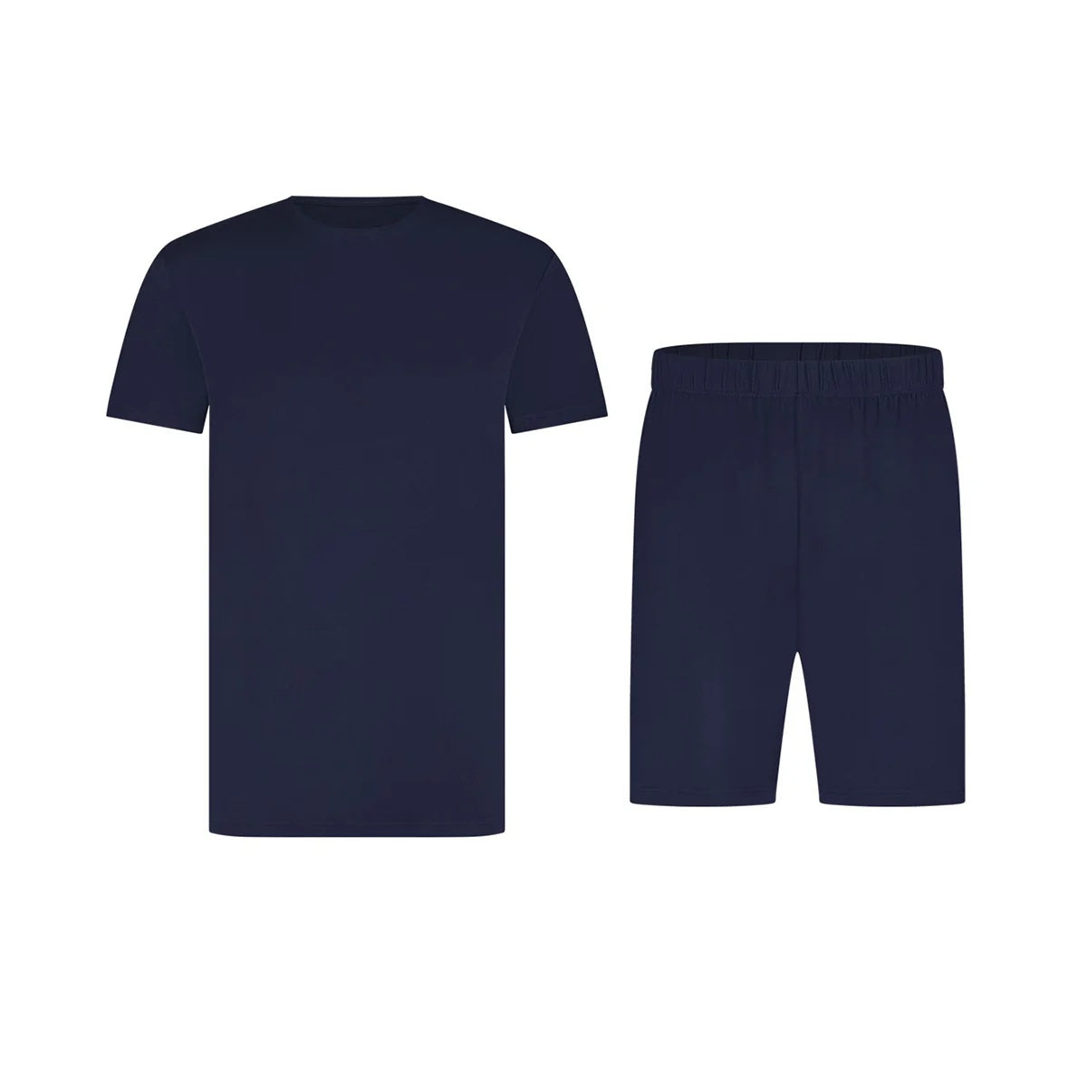 Erleben Sie entspannte Nächte und gemütliche Stunden zu Hause mit diesem Herren-Pyjama-Set in klassischem Navy-Blau. Die Kombination aus einem kurzärmeligen T-Shirt und einer kurzen Pyjamahose bietet optimalen Komfort und Bewegungsfreiheit - perfekt für ruhige Nächte oder entspannte Loungemomente.